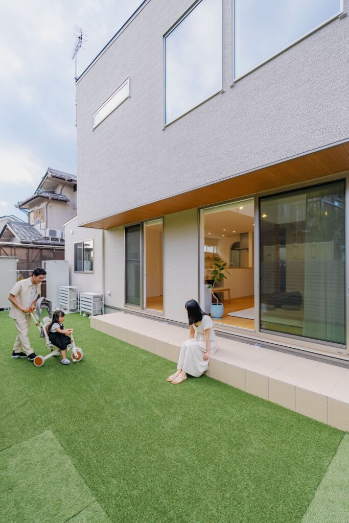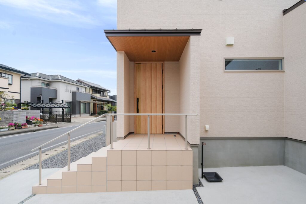 窯業系サイディングの外壁と、手すりの色を合わせた、やさしい印象の外観です。