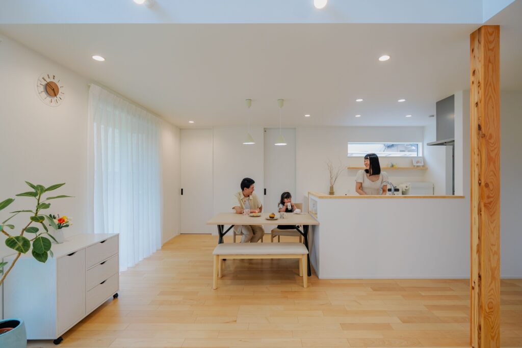 腰壁で手元を隠しつつ、全体を見渡せるキッチンです。