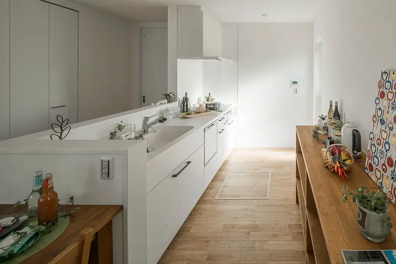 白でトーンをそろえ、照明や小物で北欧テイストをプラス。
