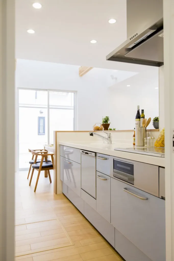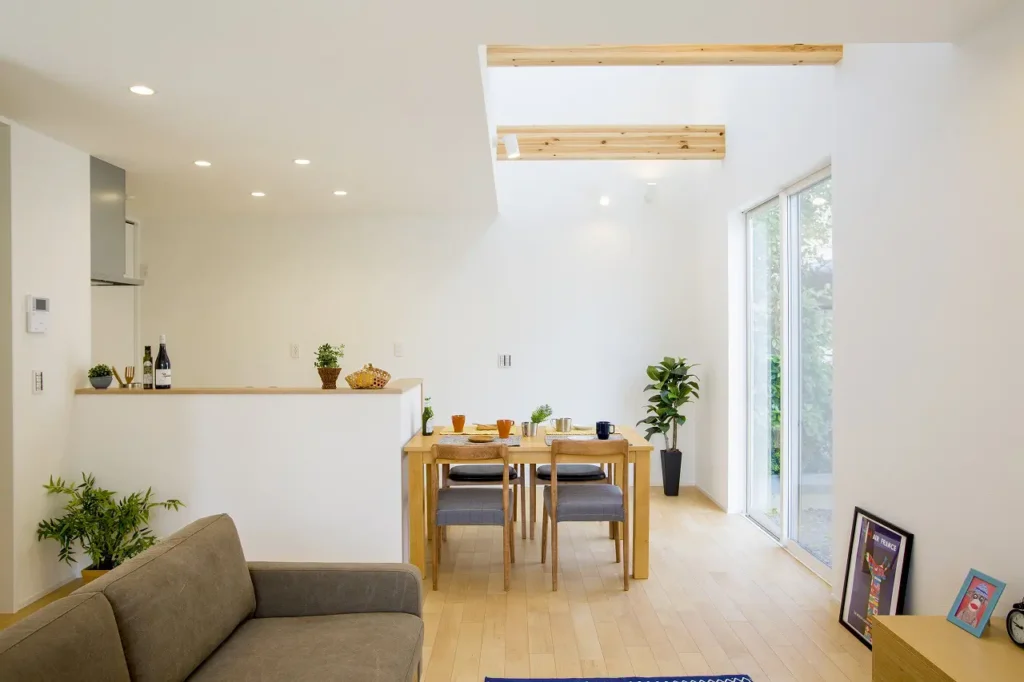 ハードメイプルの床に、吹き抜けの梁がアクセントになった空間。