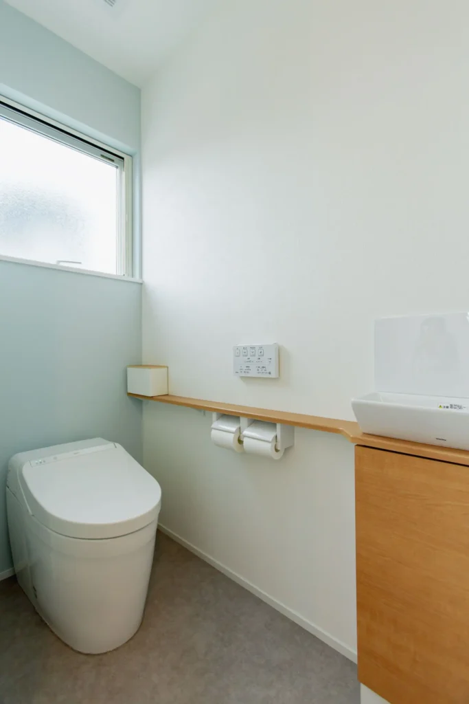 脱衣室には、その場で洗濯周りの作業が完結するカウンターを造作。