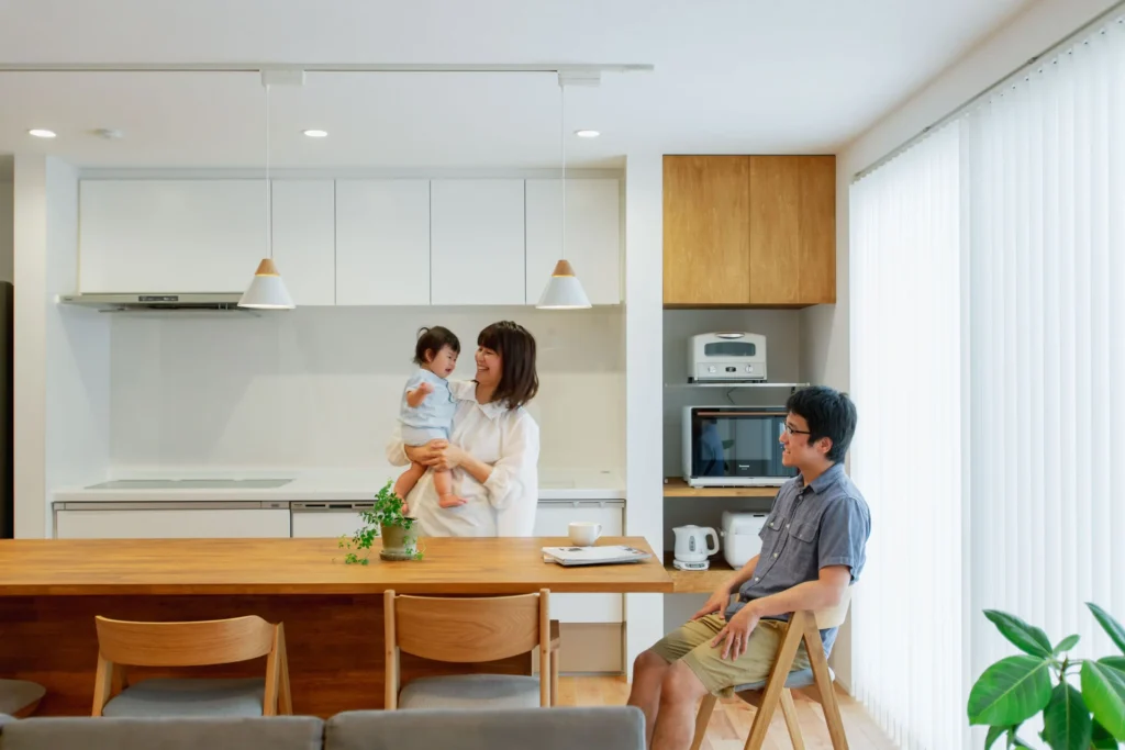 壁付けキッチンに大きな造作ダイニングテーブルを合わせました。