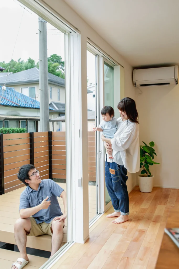 窓を開ければウッドデッキとつながり、開放的な空間が生まれます。