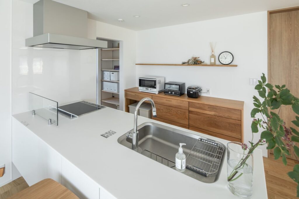 フルフラットキッチンを採用し、冷蔵庫はパントリーへ。見せると隠すで、メリハリのある空間に。