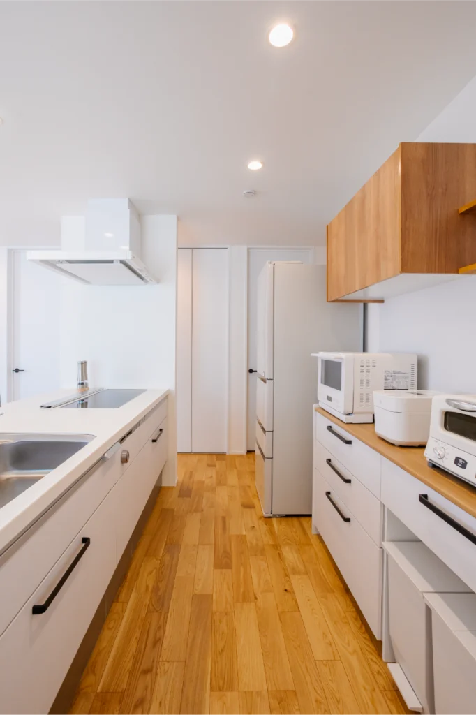 白とオークのシンプルなまとまりに丸い照明を合わせ、柔らかなアクセントに。