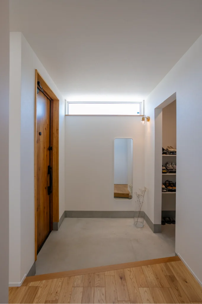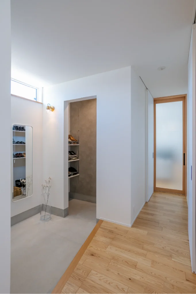 スクエアの垂れ壁で区切ったシューズクロークで、すっきりをキープ。