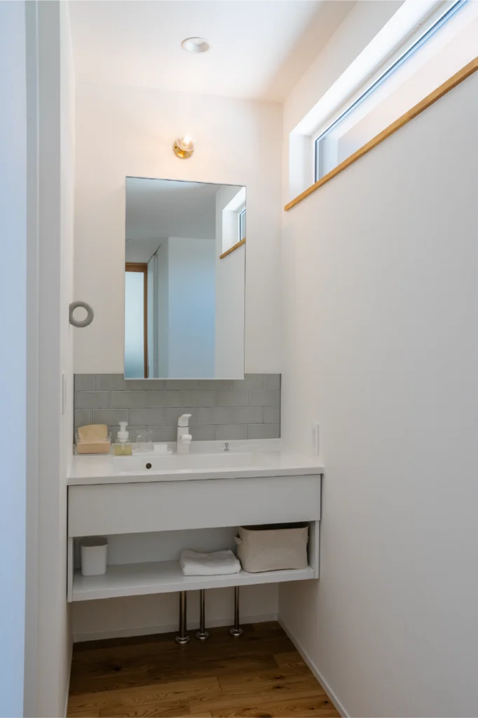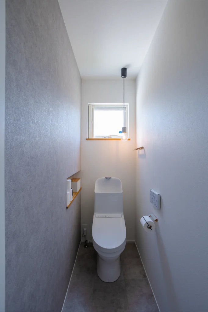 造作ニッチにトイレットペーパーなどをコンパクトに収納します。