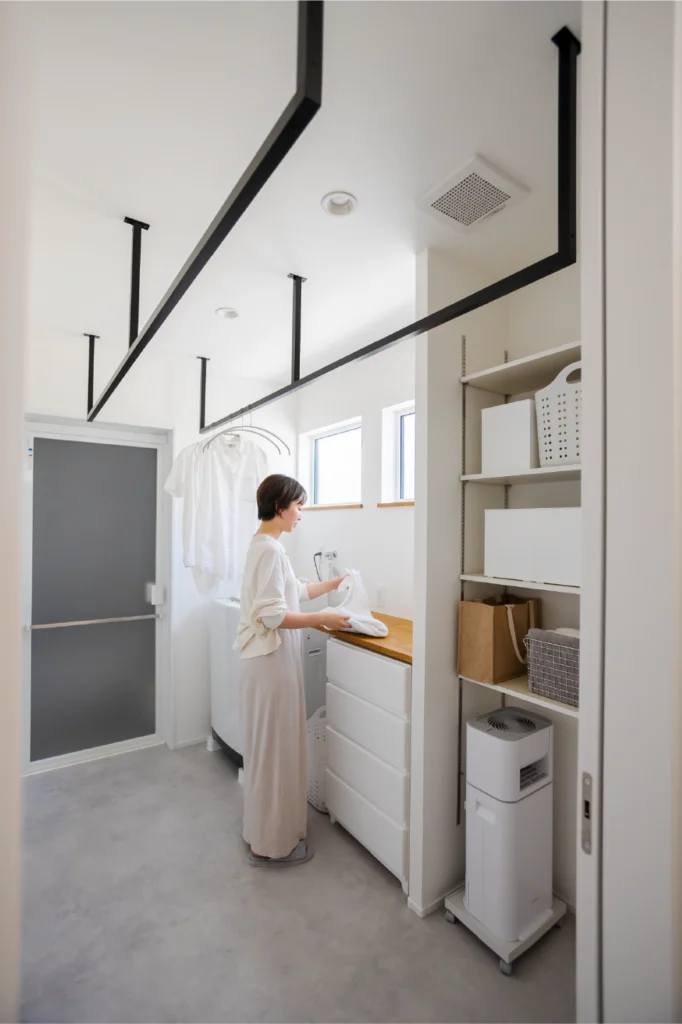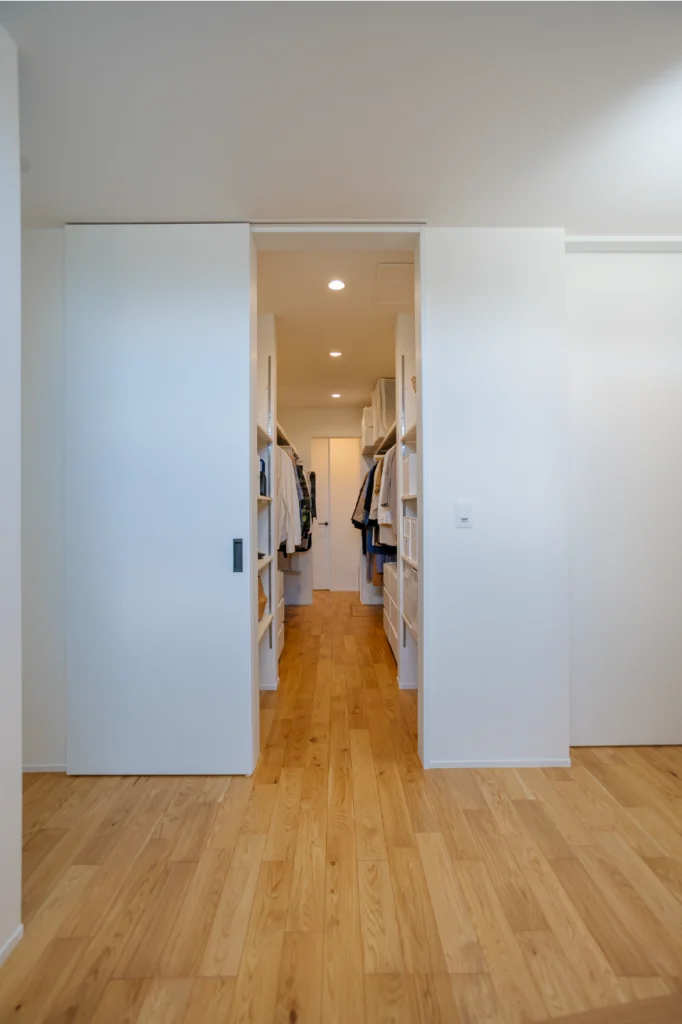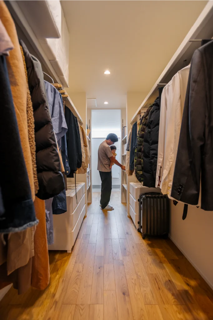 玄関を上がった正面に、お出掛けや帰宅動線としても便利なウォークインクローゼットを設けました。