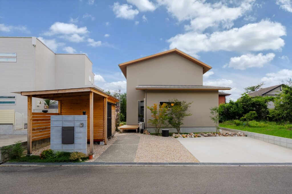 塗り壁の柔らかな質感に、鎖樋が縦のリズムを添え周囲と穏やかに調和。