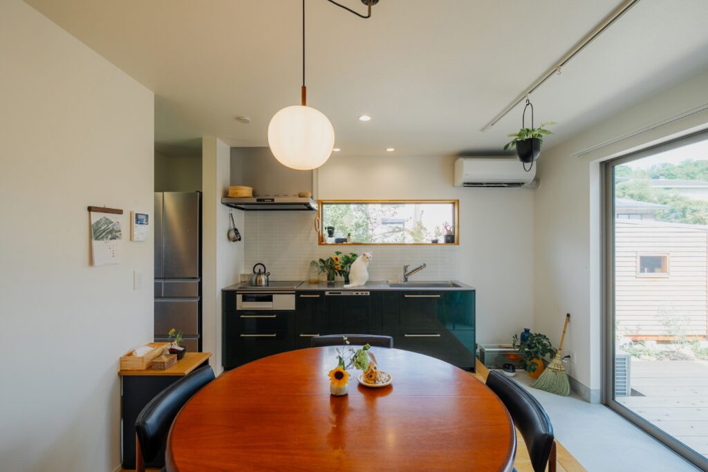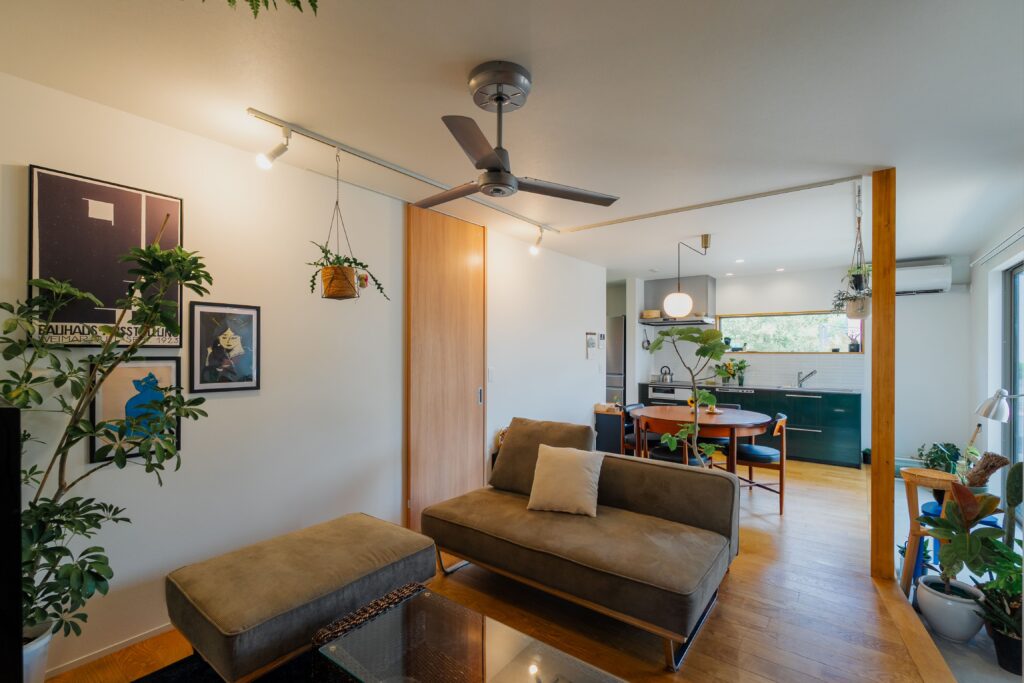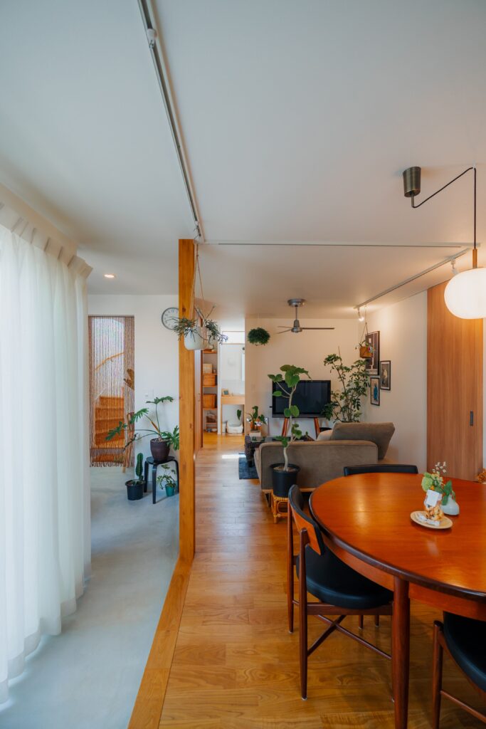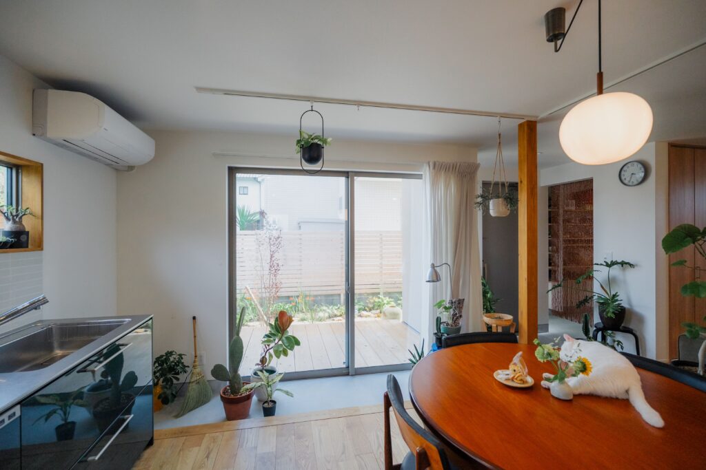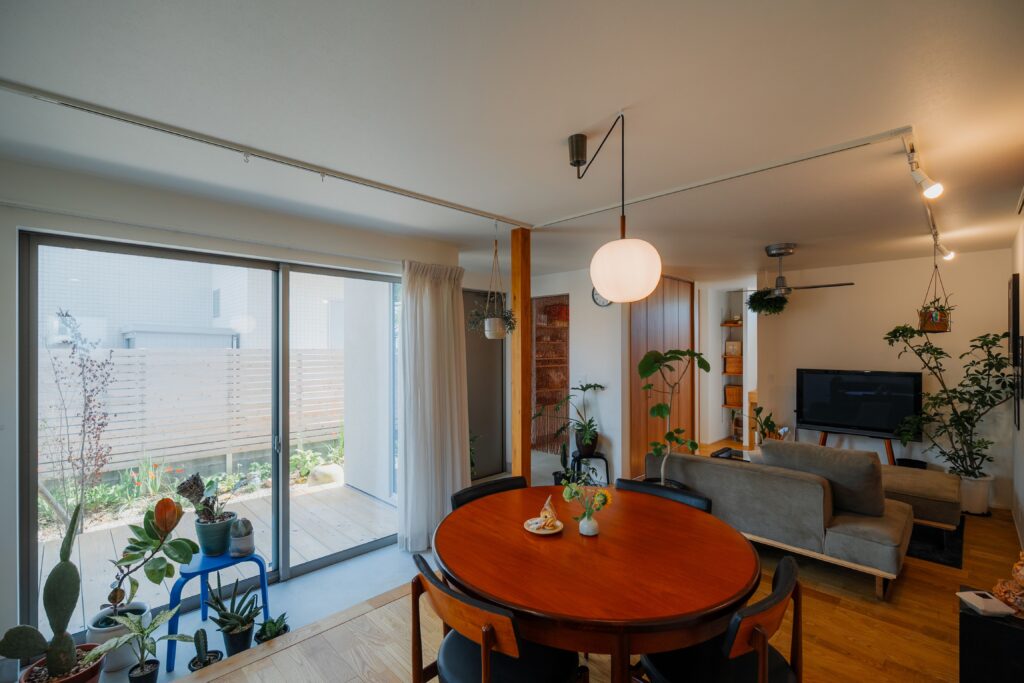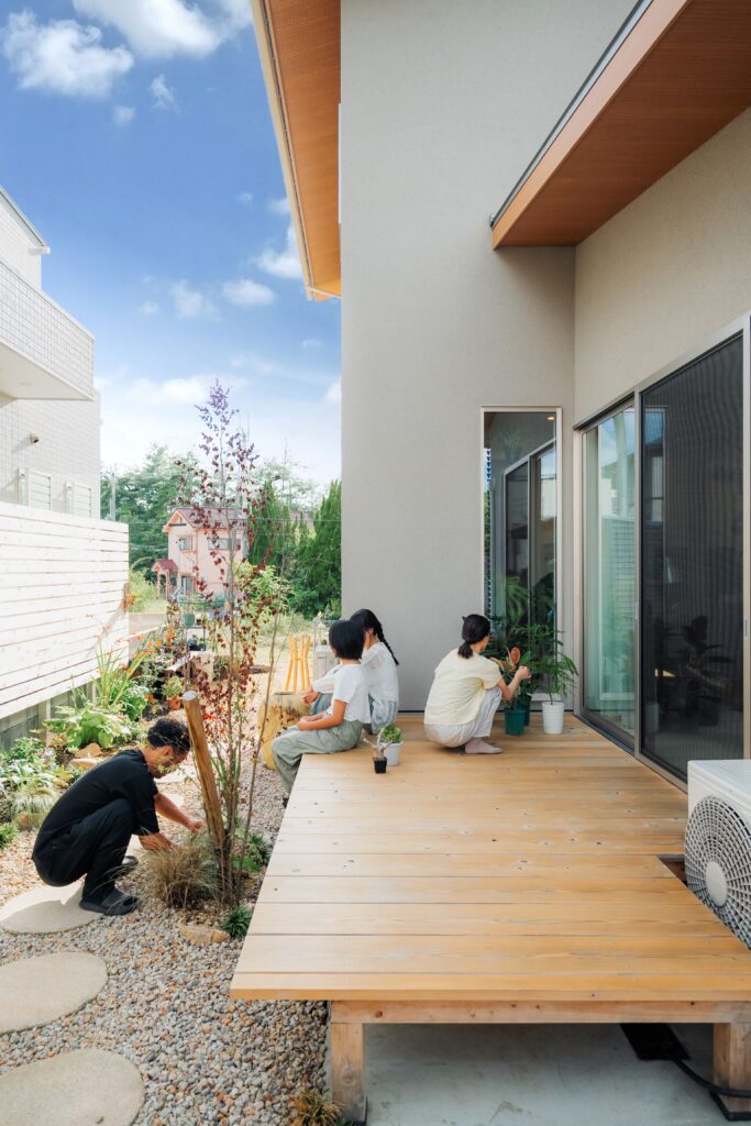 室内と庭の植物が暮らしの背景となり、家族が思い思いに過ごせる場が自然と育まれます。