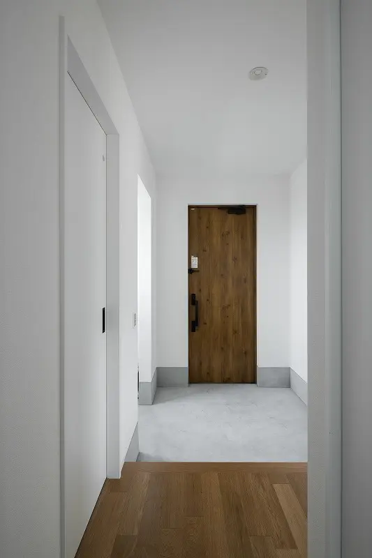 モルタル仕上げの玄関。垂れ壁の奥にシューズクロークを設けました。