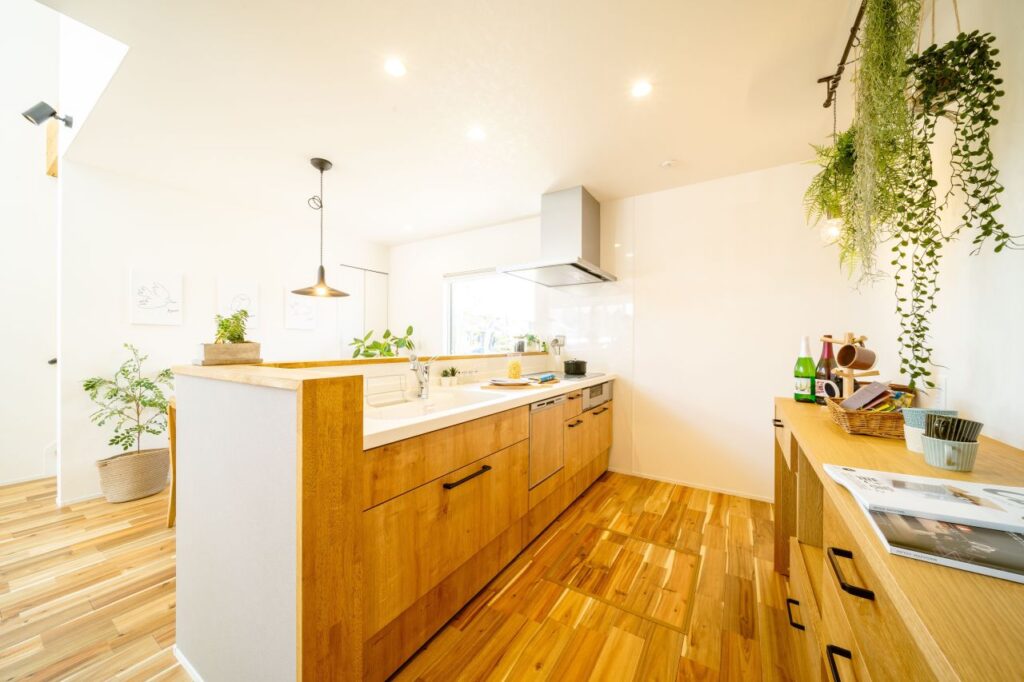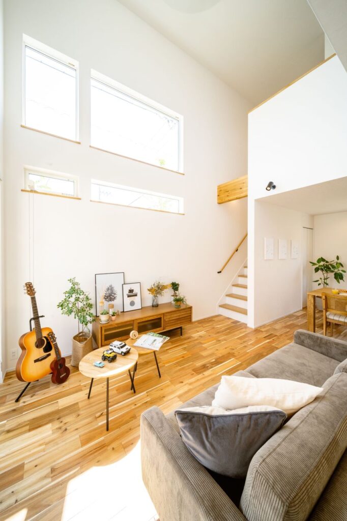 表面の凸凹が味わいを生み出すハンドスクレイプ加工を施したアカシアの無垢床に、吹き抜けから届く光が美しさを演出。