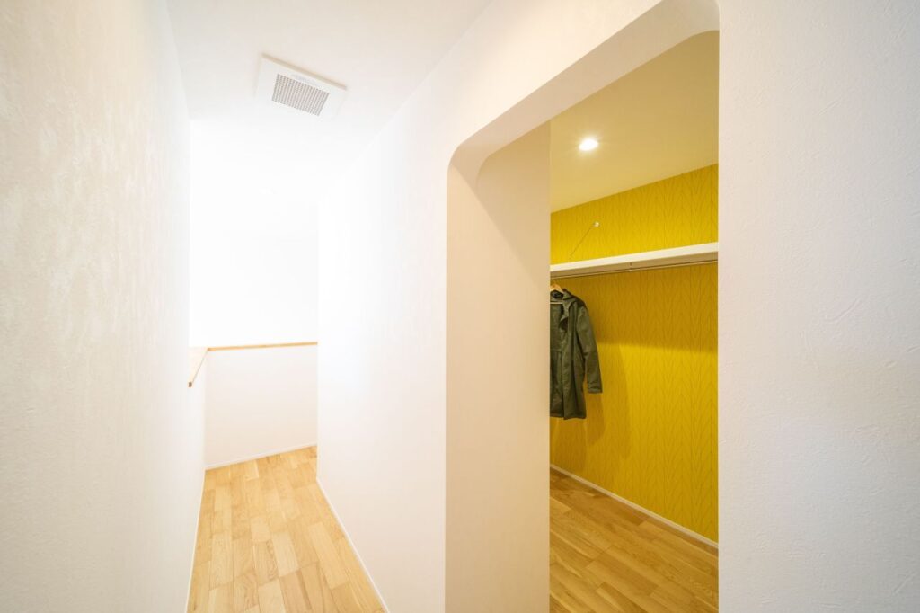 角丸の垂れ壁奥に設けたウォークインクローゼットで、家族の衣類をまとめて収納。