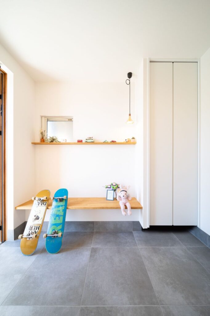 お気に入りを並べる飾り棚とベンチを造作した玄関です。